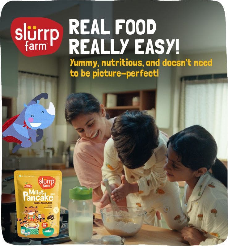 For our kids, it’s never about how the food looks, it’s about the love (and the yumminess) behind it. At Slurrp Farm, we believe in keeping it real: Real Food, Really Easy. Because mealtimes should be about joy and those little in-between moments of cooking and feeding.