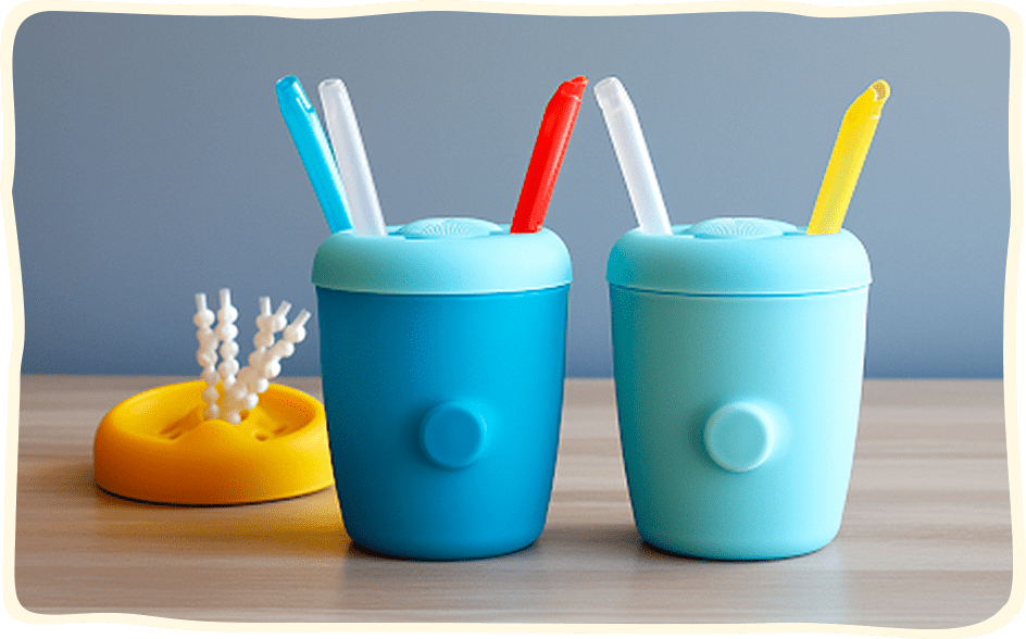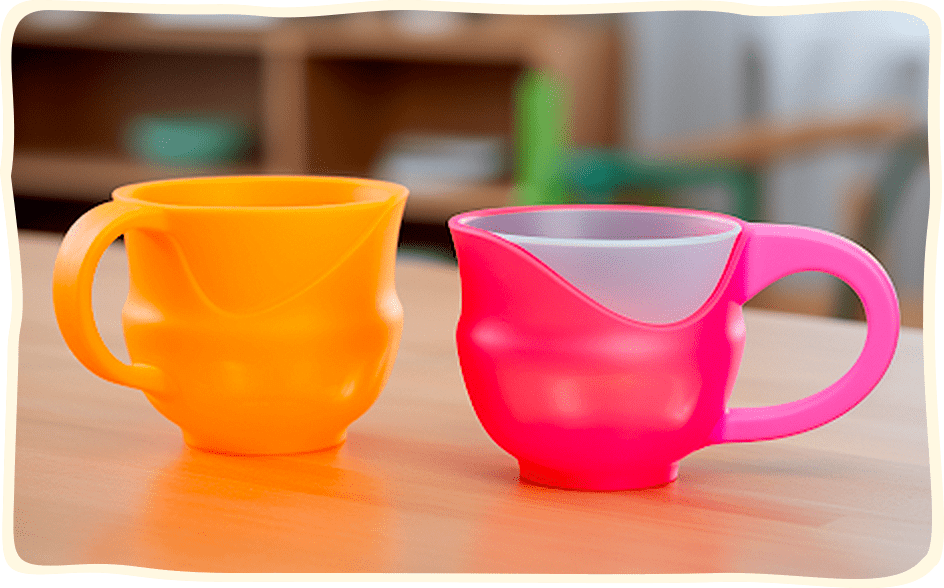 1) Open cups: Offer water in an open cup or straw cup instead of bottles, sippy cups with hard spouts, or 360-degree cups without spill valves. Opt for steel glasses or silicone cups.