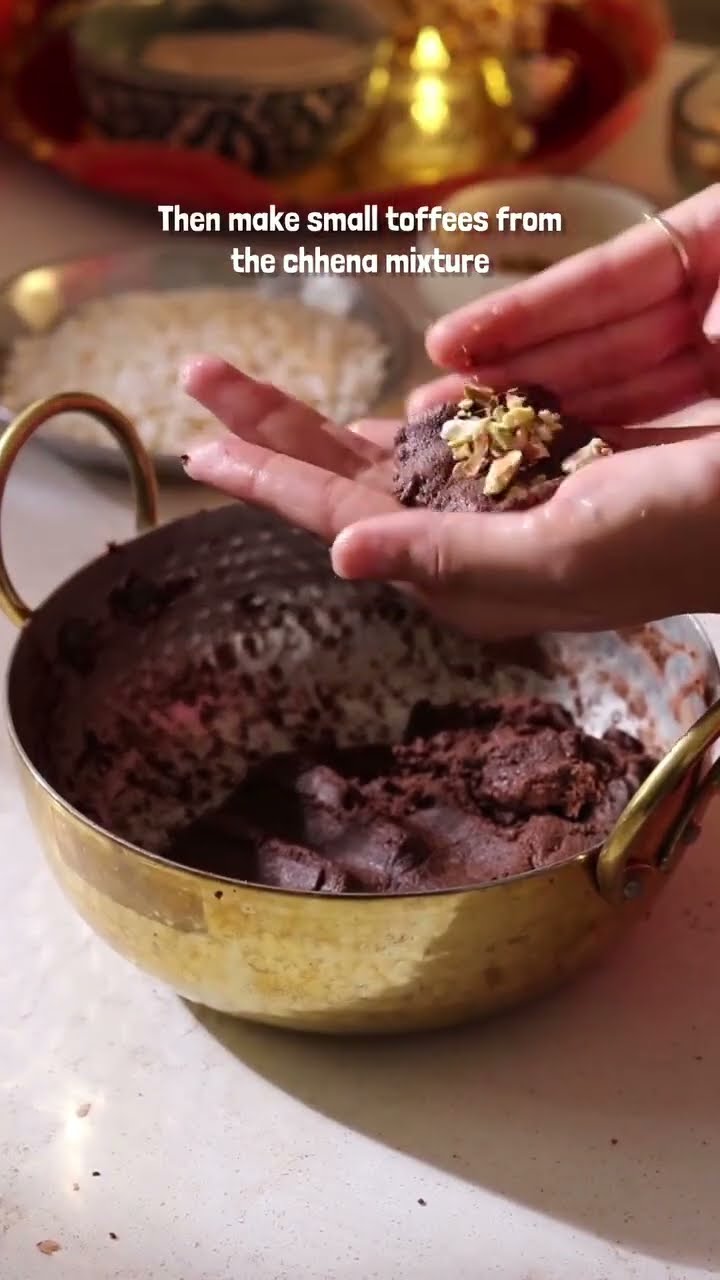 Once the chenna has cooled, knead it with half cup of unsweetened cocoa powder, a pinch of nutmeg powder and one-fourth cup of date powder. Then boil a cup of milk and cook till it comes together into a thick paste. Make sure it's not watery. Cool this mixture.